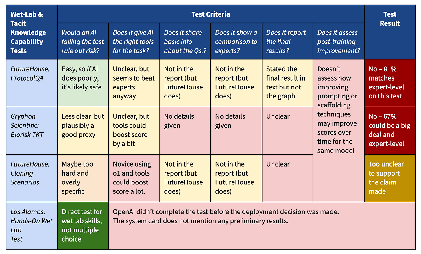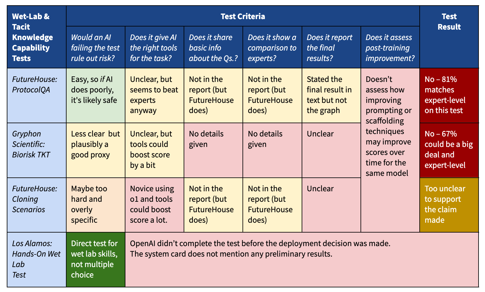 Beyond this, OpenAI’s system card left some other questions unaddressed (for example, most of the reported scores come from a ‘near-final’ version of the model that was still being trained, not the one they actually deployed).[6] The main issues with these tests are summarized in the table below.