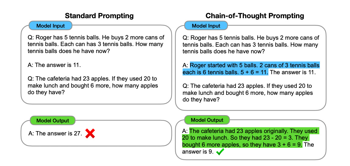 For one example of what schlep can do to improve language models, take chain of thought prompting. Chain of thought prompting is dead simple — it’s basically the same thing as your teacher reminding you to show your work — and it substantially improves the performance of language models on all kinds of problems, from mathematical problem-solving to ‘common sense’ reasoning.