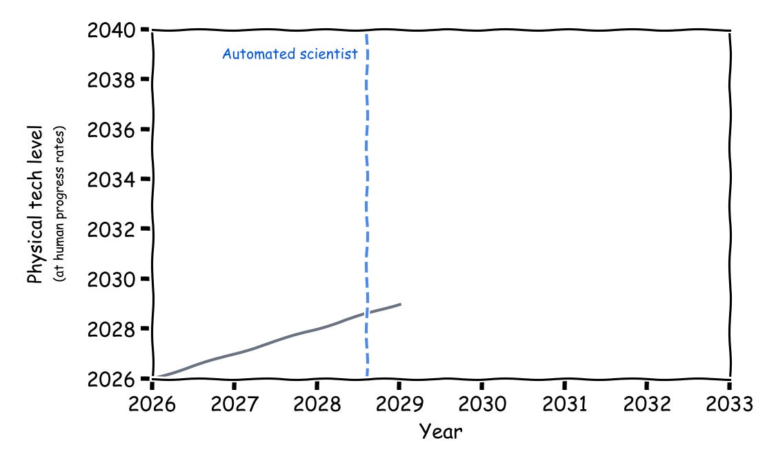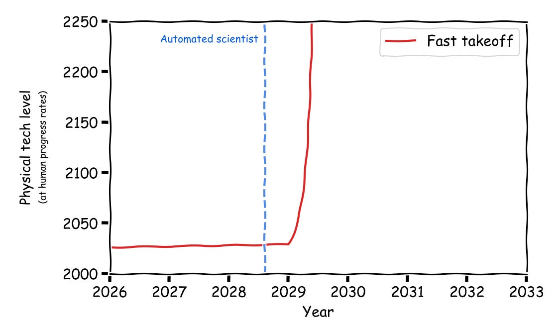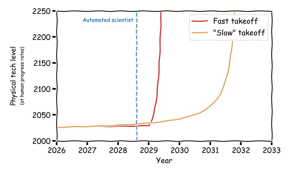 On the “slow” takeoff view, there is still a super-exponential feedback loop of AI-improving-AI. It’s just that we need to incorporate physical automation of the entire AI stack to get that feedback loop going, so it’s more gradual (and we actually see physical signatures before we get the full automated scientist). But even “slow” takeoff still means that we go from automated science to an unrecognizably sci-fi world within a matter of years.